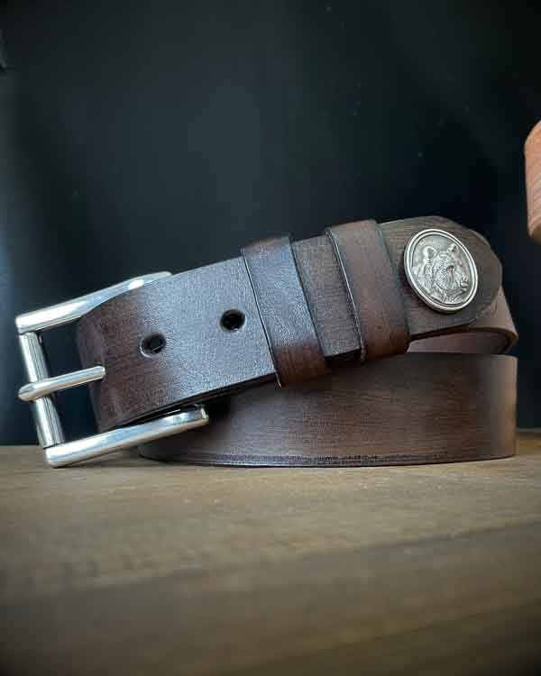 Klasický, ručne vyrobený opasok zdobený končom medveďa. Tieto opasky sú vyrobené aby vydržali všeličo, a nosením sa vám bude jeho kvalitná, hrubá koža prispôsobovať. Je vhodný na každodenné nosenie k rifliam či nohaviciam.
