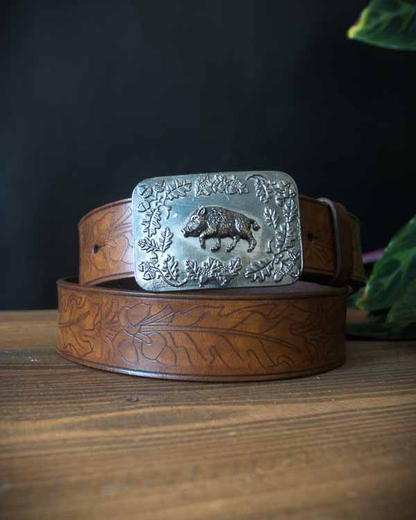 Opasok Diviak bol vytvorený pre poľovníkov a lesníkov, či obdivovateľov našich krásnych lesov a prírody. Koža zdobená dubovými listami a žaluďmi spolu s masívnou prackou s motívom diviaka zaručia, že opasok určite nebude prehliadnutý.