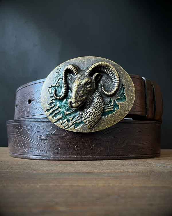 Kožený opasok s motívom muflóna bol vytvorený pre poľovníkov a lesníkov, či obdivovateľov našich krásnych lesov a prírody. Koža zdobená dubovými listami a žaluďmi spolu s masívnou prackou s motívom muflóna zaručia, že opasok určite nebude prehliadnutý.